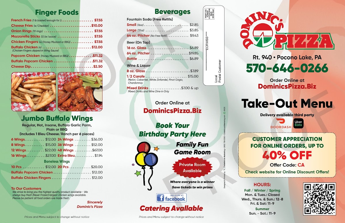 Aside from pizza and wings, indulge in delicious sides like mozzarella sticks, onion rings, and garlic bread. Reviews highlight the friendly staff and inviting ambiance, making it a great spot for family dinners or casual outings. With a fun arcade attached, there's something for everyone, ensuring the experience at Dominic's is memorable. Don’t miss the chance to savor their wonderful selection; it truly stands out as a culinary gem in the Poconos!